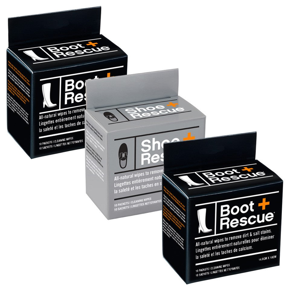 L'ensemble pratique comprend 2 boîtes de 10 lingettes BootRescue emballées individuellement et 1 boîte de 10 lingettes ShoesRescue emballées individuellement.